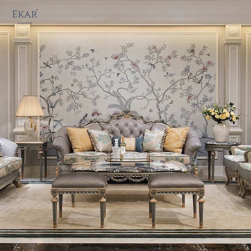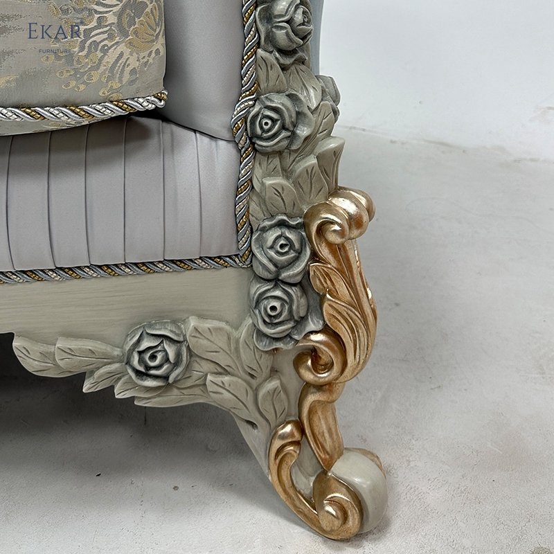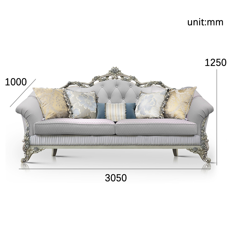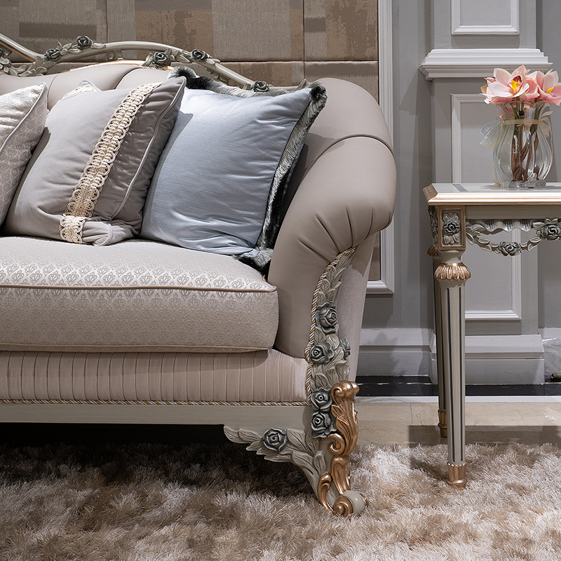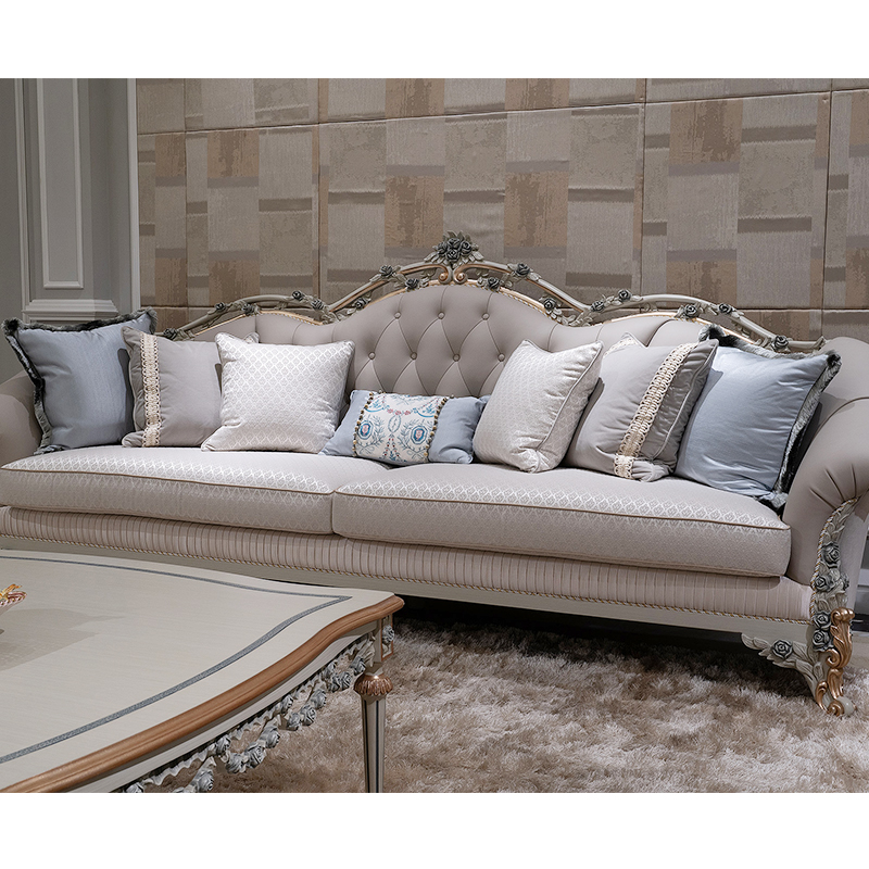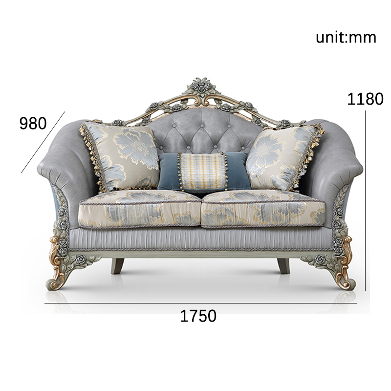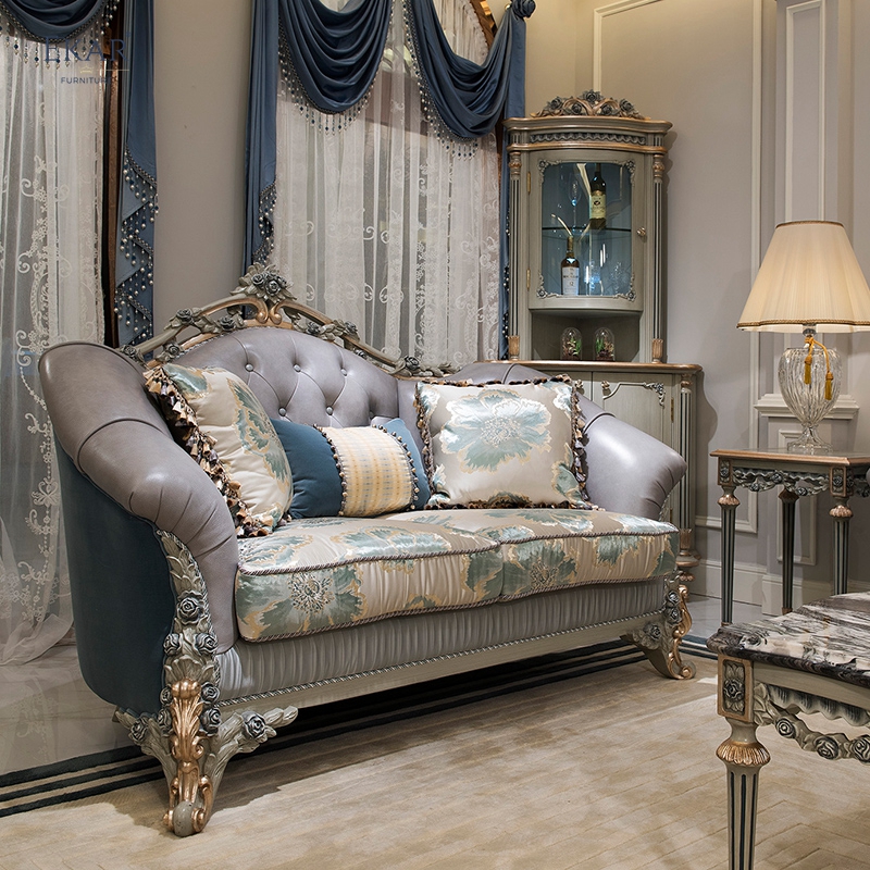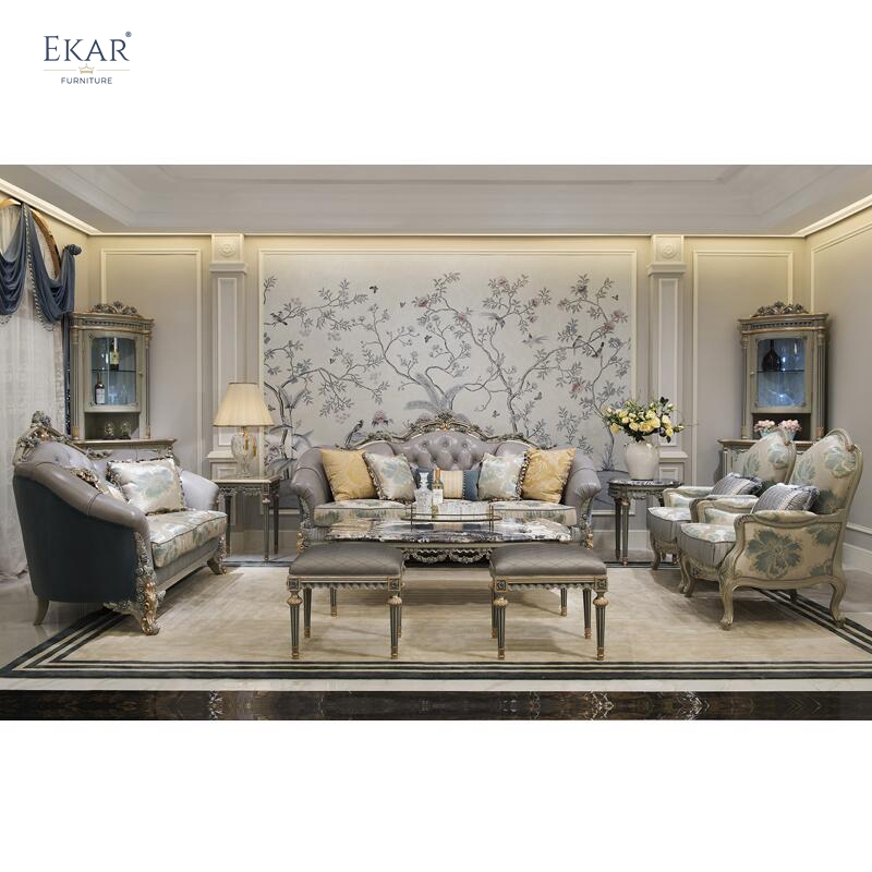Wooden Carved Classic Leather And Fabric Grey Sofa Set