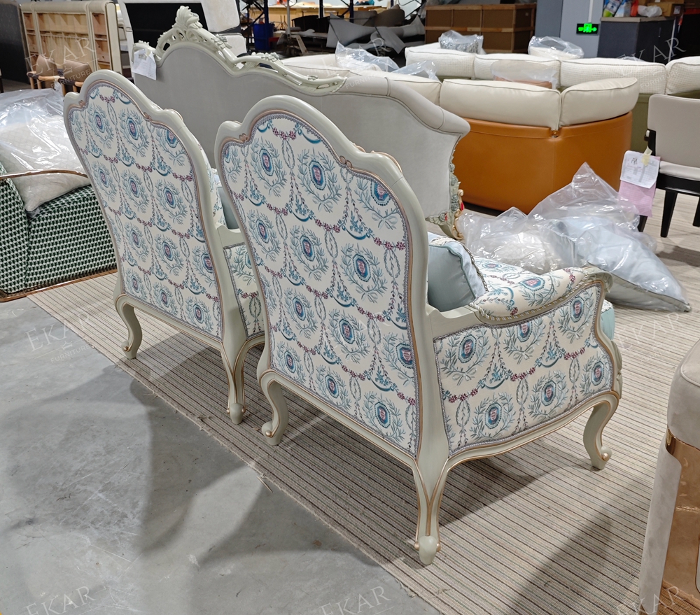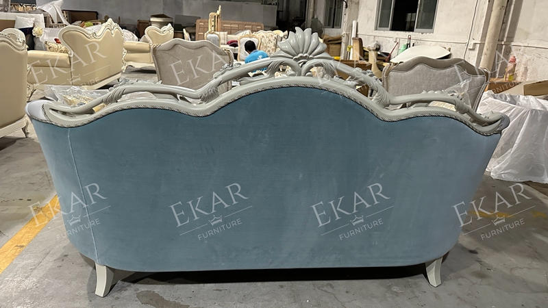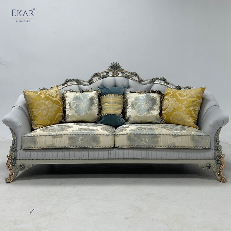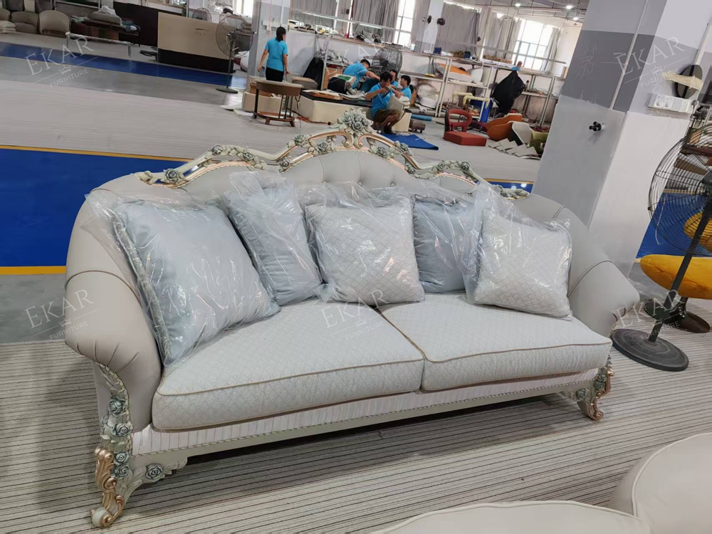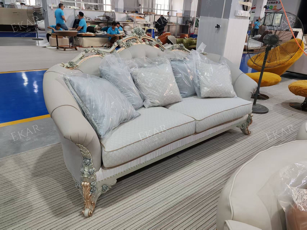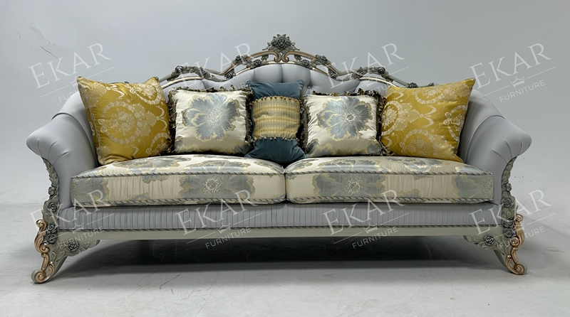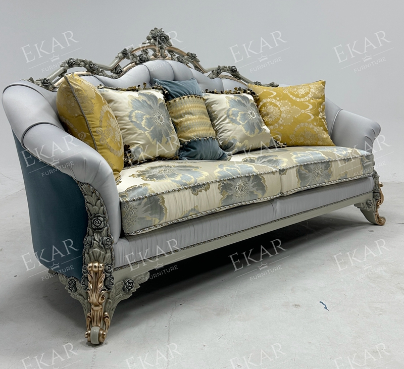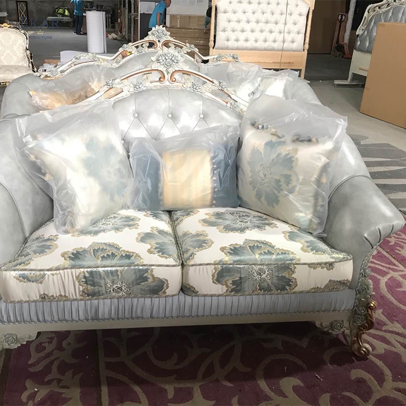 Wooden Carved Classic Leather And Fabric Grey Sofa Set