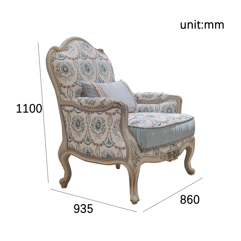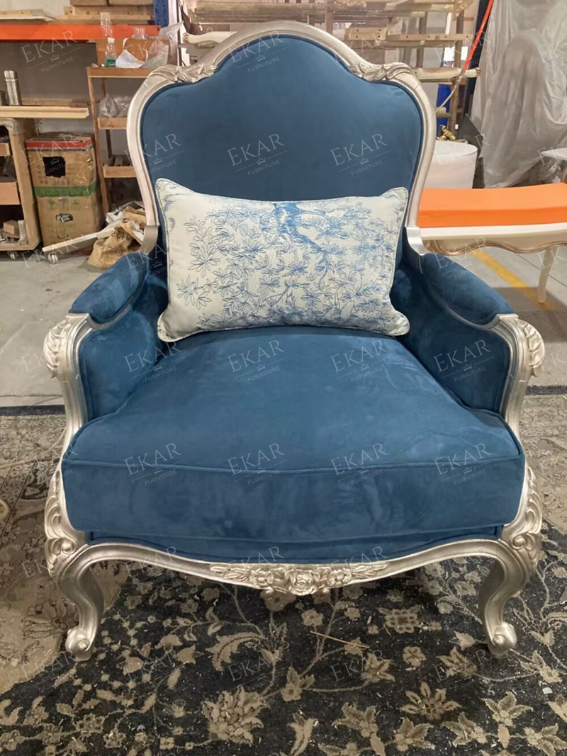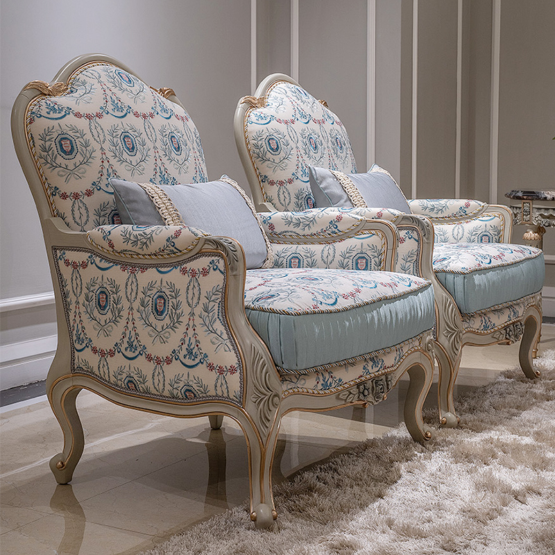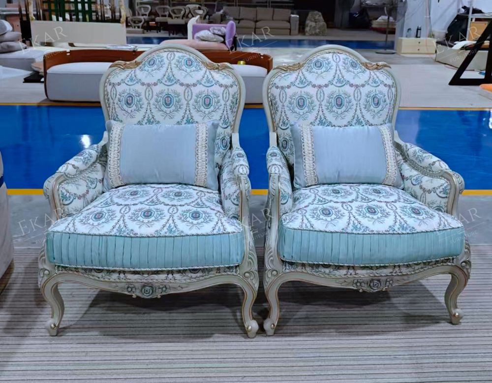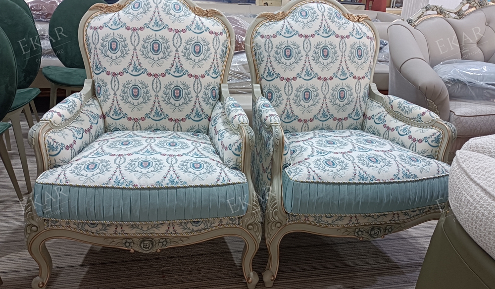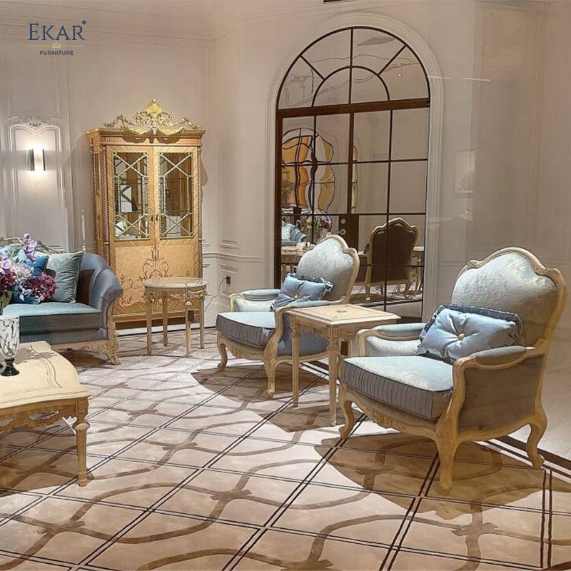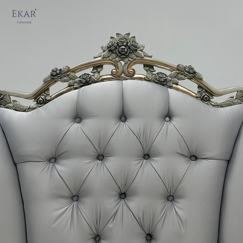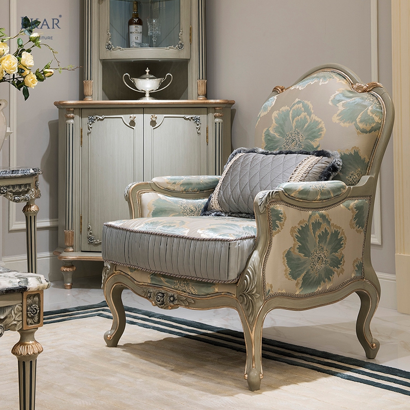 Wooden Carved Classic Leather And Fabric Grey Sofa Set